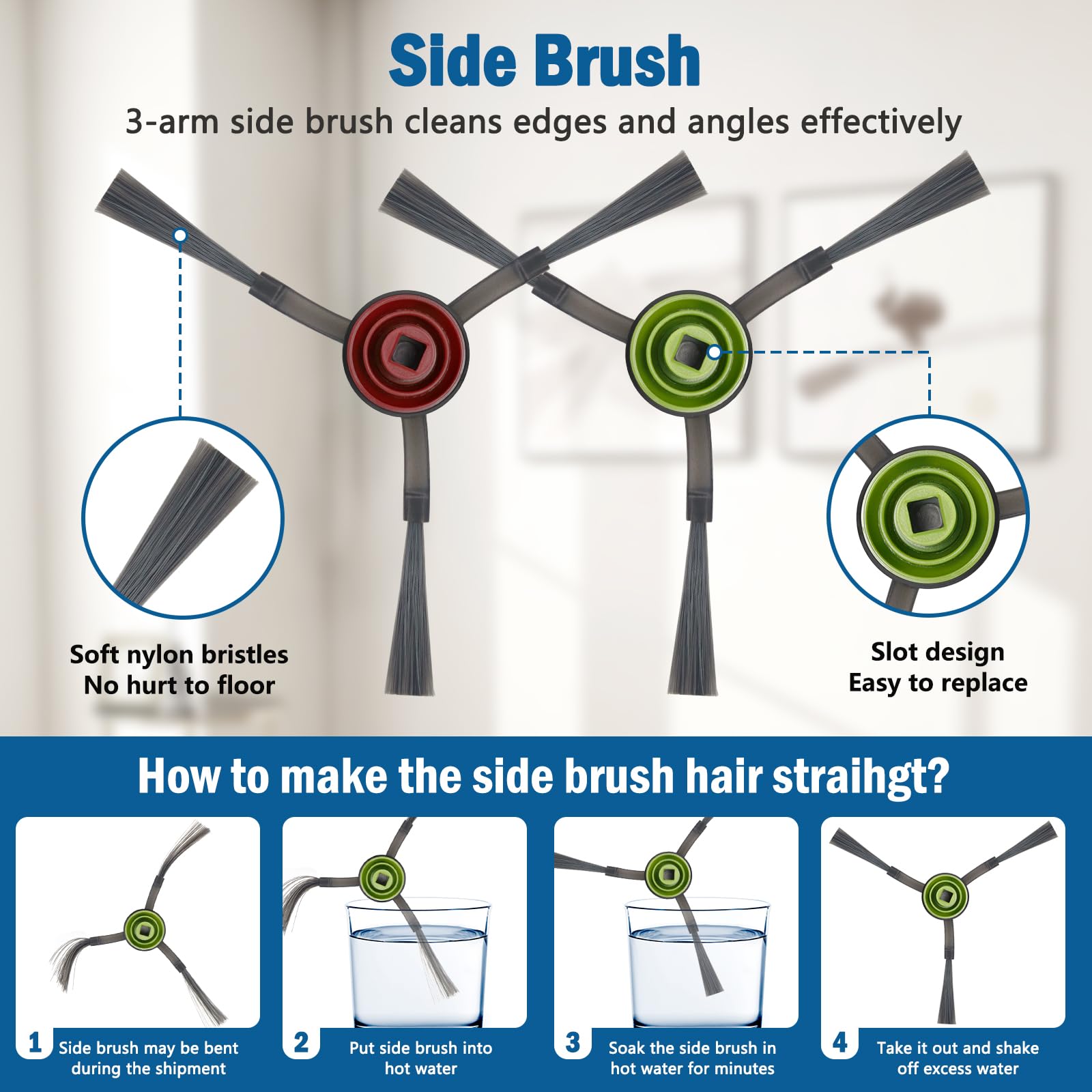 - Package Contents: 1 Roller brush 3 Filters 6 Side brushes 4 Mop cloth 4 Dust bag