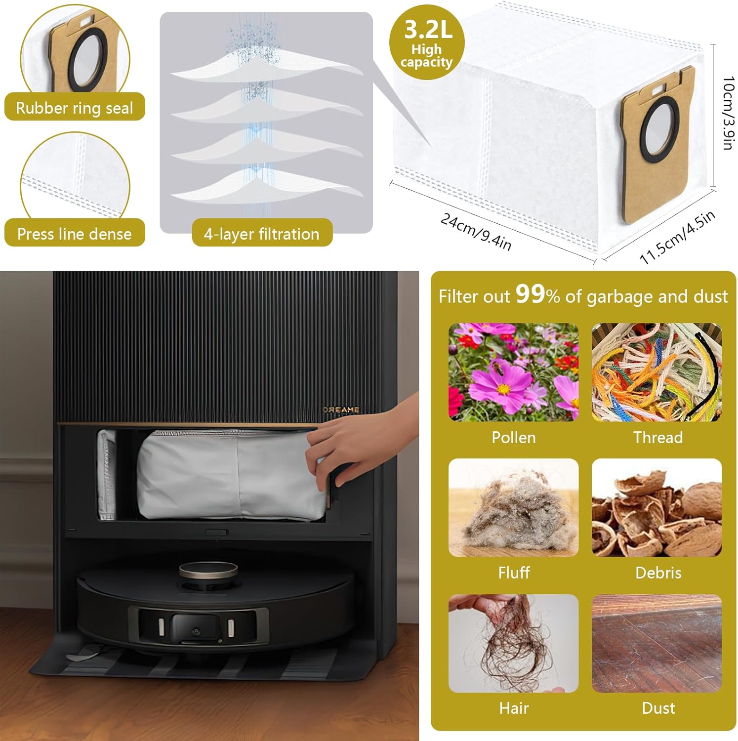 - Auto-Locking Dust Bag : These Vacuum cleaner bag is made of a high-quality filter layer made of melt-blown fiber and non-woven fabric, have a good seal, when you lift the dust bag, it automatically locks to ensure that dust and dirt stay inside.