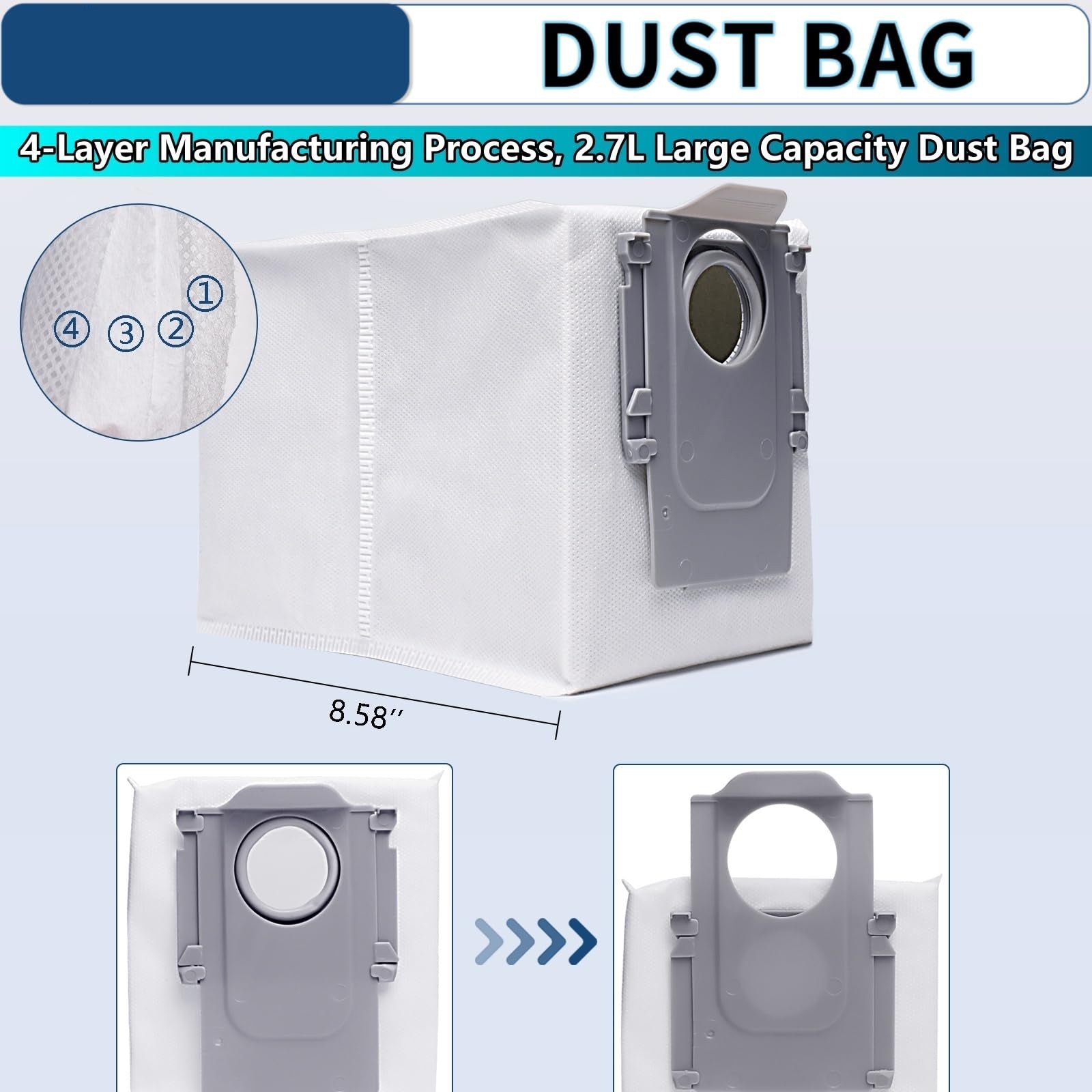 • 【Kit includes】The package includes 1 multi-surface rubber brush, 4 mop pads, 4 HEPA filters, 4 side brush, 6 Vacuum collection bags, and a mounting screwdriver.