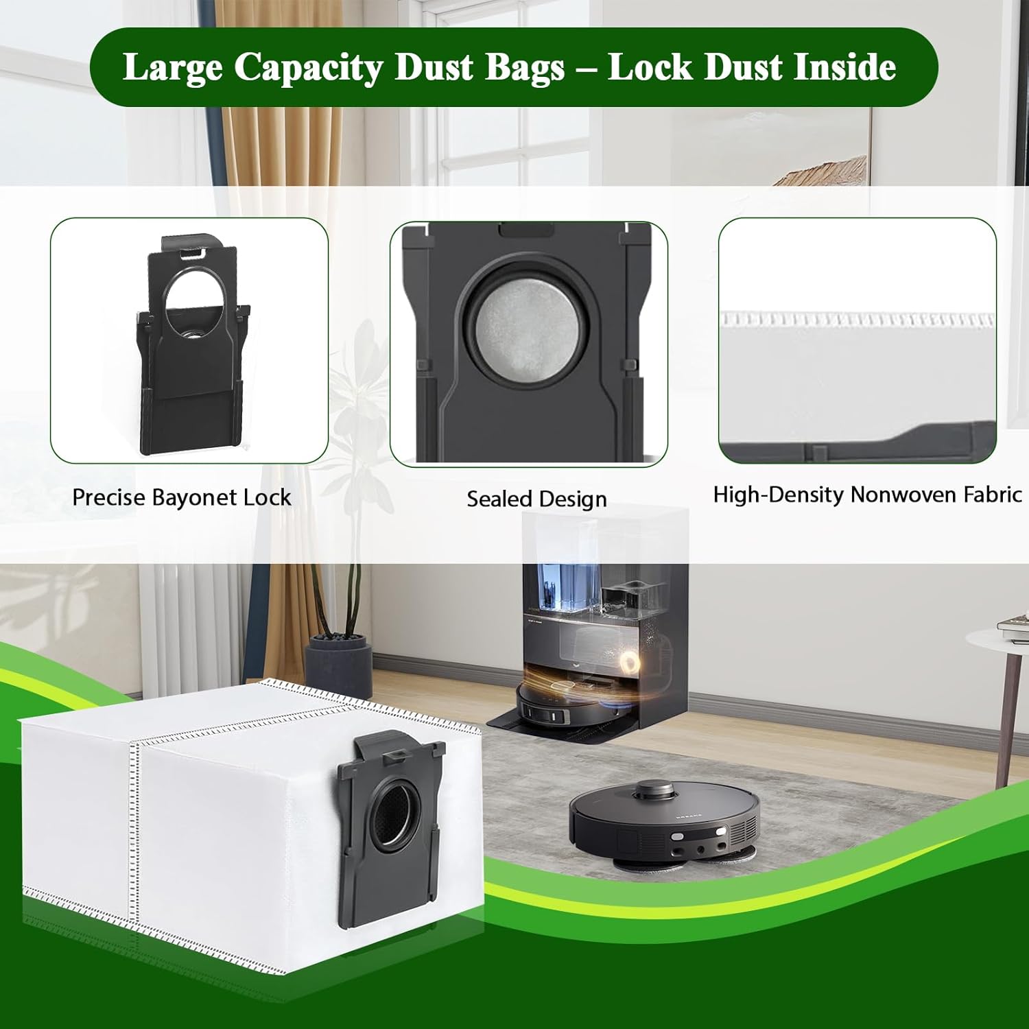 - Mop Pad & Dust Bag:The mop pad is highly absorbent, lint-free, and reusable. The large-capacity dust bag holds up to 30 bins of dirt.