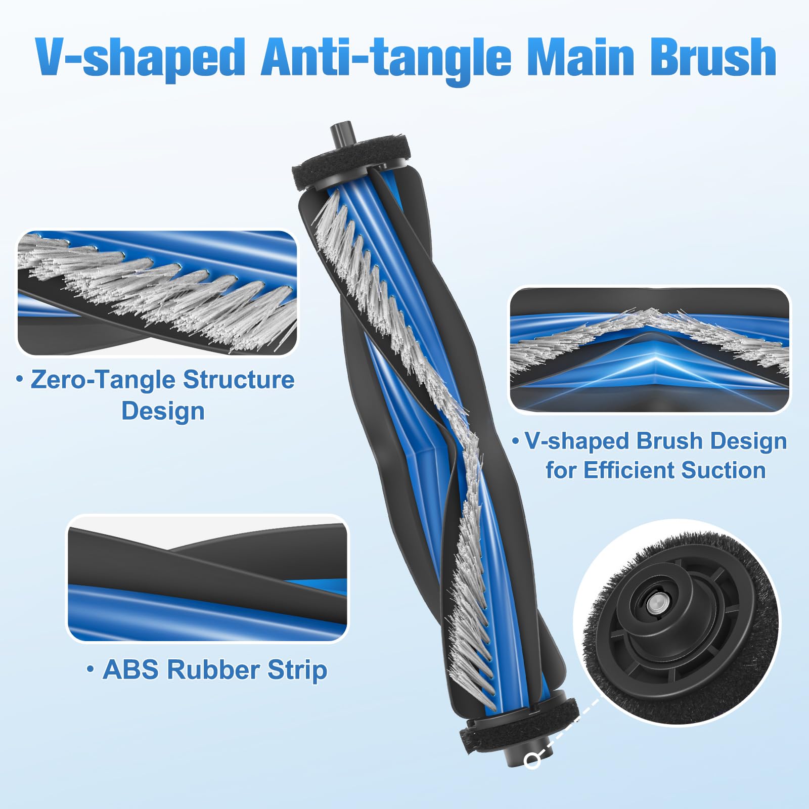- Upgraded Anti-Tangle Brush: V-shaped anti-tangle main brush for X8 OMNI with dual combs for efficient dust pickup, reduced hair tangling, quiet deep cleaning, multi-surface use, and easy maintenance. Dual side brushes clean along walls with precision. Anti-tangle design for smooth, uninterrupted cleaning. Say goodbye to tangled hair and clean freely across your home